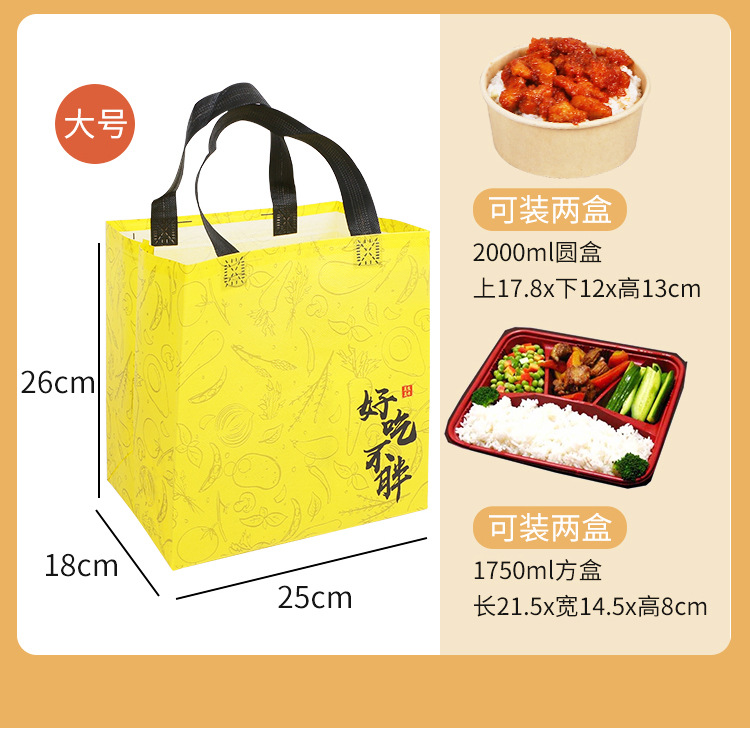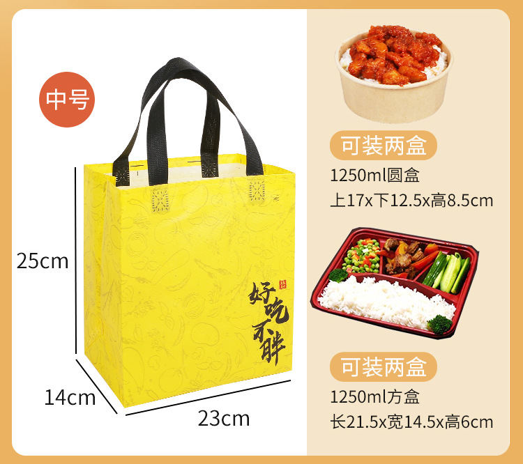 • 广告宣传:无纺布覆膜外卖袋可以作为商家的广告宣传工具,客户可以在袋子上印上自己的品牌LOGO或宣传语,增加品牌曝光率。
